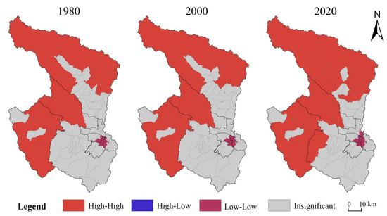The LISA map of local autocorrelation revealed the specific location of the spatial distribution of agglomeration of ESV per unit area in Xining and the changing status of the clustering types during the period from 1980–2020. The spatial agglomeration categories of ESV per unit area in Xining were classified into four agglomeration types: high-high, high-low, low-low, and insignificant. The high-high categories of spatial agglomeration of ESV per unit area were mainly distributed in northern and western Xining (Figure 4), including the northern and western townships of Datong Hui and Tu Autonomous County and the northern townships of Huangzhong District and within Huangyuan County. These areas are all at high altitude, with extensive distribution of forests and grasslands, and they mostly show land use by pastoralism or ecotourism as the mainstay industries, slow development of urban construction, and a low negative impact of human production and living activities on the reduction in the area of forest and grassland. The low-low categories of spatial agglomeration of ESV per unit area were mainly located in the intersection of major rivers (the Huangshui, Nanchuan River, and Beichuan River) in the southeast of Xining, including a few township streets in the eastern part of Chengxi District, the western part of Chengdong District, the Chengzhong District, and the southern part of Chengbei District. These areas are highly densely populated, economically active, major expansion areas for urban construction in Xining City, with low ecosystem service value. The insignificant agglomeration types of ESV per unit area were widely distributed between high-high-agglomeration-type areas and low-low-agglomeration-type areas. The area of the high-high categories of spatial agglomeration of ESV per unit area had been expanding, increasing from 19 townships and streets to 24 in 2020, and the low-low categories of spatial agglomeration had increased by a total of 2 townships and streets in 40 years, which indicated that the spatial concentration of ESV per unit area in Xining has been increasing, and the ESV per unit area was increasingly showing a clear circle structure of the high-high type in the peripheral region, the insignificant type in the transitional region, and the low-low type in the inner core region.