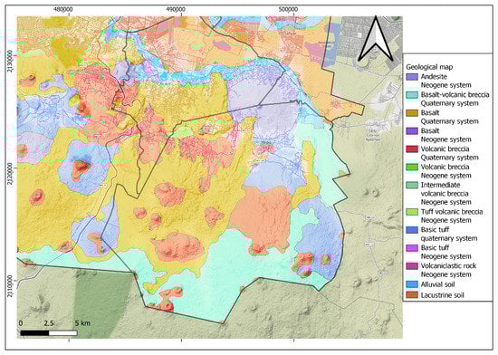 In the center, south, and west of the study area, the dominant soil type is andosol (63%), and in the north and east there are feozem class soils (17%), which are used for planting crops of corn, beans, nopal, or fruit trees. These soils are highly sensitive to erosion [31]; they are basically made up of lava and scoria fragments, agglomerate, and pyroclastic deposits of various sizes, surrounded by a matrix of sand, silt, and clay-sized sediments. These deposits, due to their high permeability, make the area one of the main aquifer recharge zones in the basin.