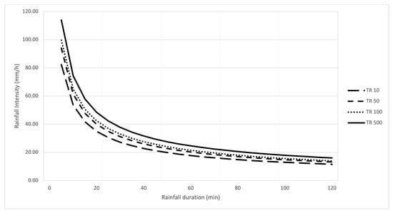 Intensity–frequency–duration curves for the return periods TR 10, 50, 100, and 500 years.