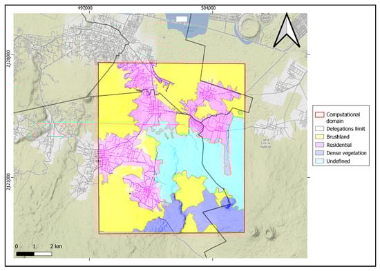 The computation domain considered for the hydraulic simulations occupies an area of approximately 79,400 km and is shown in Figure 4, delimited by the red line. The figure also shows the distribution of land uses as they are classified by INEGI and available in its database [44].
