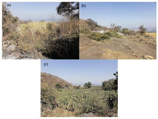 Photos of the “undefined” soil classified by INEGI with the following characteristics: (a) spontaneous vegetation; (b) barren areas; (c) nopal cultivation.