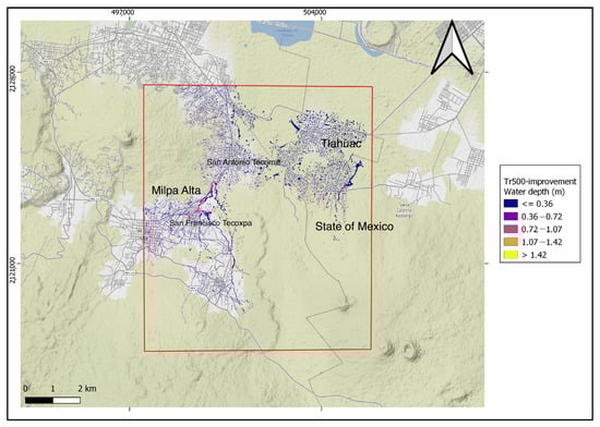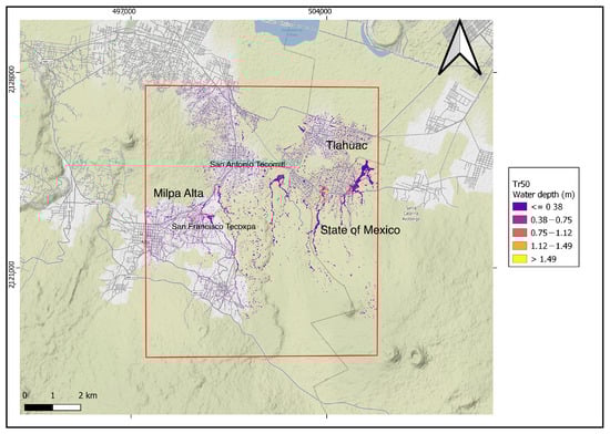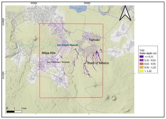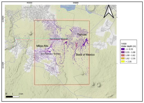 The results of the hydrodynamic simulations carried out in this work, induced by precipitation scenarios corresponding to events with different probabilities of occurrence (return periods from 10 to 500 years), provide important information on the hydraulic structure of the study area. In the case of more frequent events (Figure 6 and Figure 7), the current condition of land use determines runoffs that can generate flood levels ranging from about 40 cm up to maxima > 1.49 m. The runoffs particularly affect the eastern portion of the computing domain, on the border between the Milpa Alta delegation and the State of Mexico and between Milpa Alta and Tlahuac. Runoffs smaller than 40 cm are ephemeral; however, water depths exceeding one meter can be observed in the residential portions north of the study area. These stagnations occur mainly in the municipality of San Juan and San Pedro Tezompa (State of Mexico), which is listed among the most susceptible to flooding in this area, according to the General Coordination of Civil Protection of the State of Mexico [54].