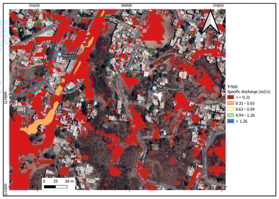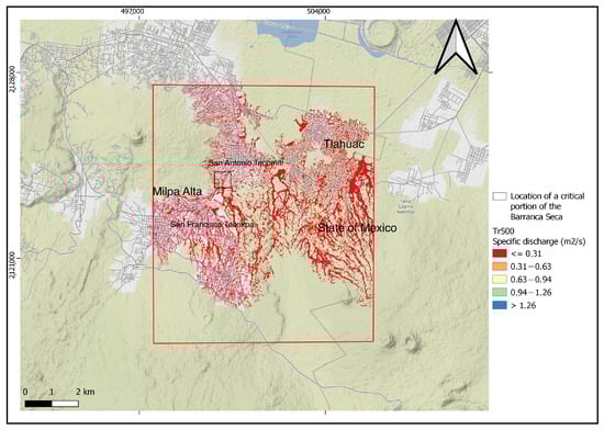 From maps related to all return periods, it can be seen that the main water collector channels towards the inhabited centers are natural canyons that descend from the mountains to the south of the study area. In the municipality of San Antonio Tecómitl, one of these channels takes the name Barranca Seca and runs through the town. The channel is cemented, and its depth varies between 50 cm and 1.50 m. Simulation results also provided specific discharges, which describe the variation over time of both water velocity and depth as a linear function (discharge q = [m/s/m]) [49,50]. Figure 10 shows a distribution map of the specific discharges calculated for the 500-year return period. The detail on a portion of the Barranca Seca (Figure 11) shows that discharge reaches values between 0.63 and 0.94 m/s.