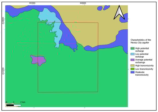It is important to consider that, according to information provided by INEGI [60], this part of the study area crosses the region of high recharge potential of the aquifer (Figure 15). However, given the current conditions of land abandonment and the runoff values calculated for the different precipitation scenarios considered it is very probable that water infiltration is prevented or very limited.