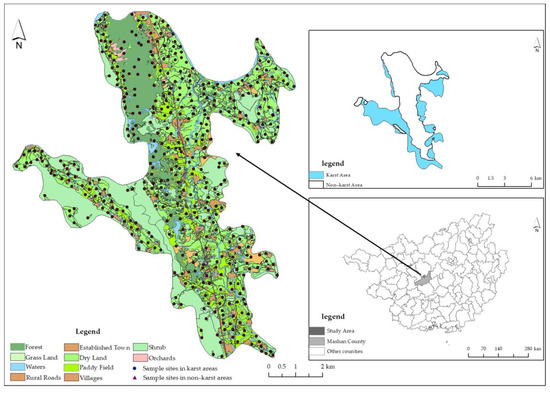 The study area is located in the northern part of Mashan County, Nanning City, Guangxi Zhuang Autonomous Region (Figure 1), with the geographical coordinates of 23.73°~23.85° N, 108.09°~108.20° E. It has an area of 64 km2 and is characterized by a southern subtropical monsoon climate, with four distinct climatic seasons and an annual average temperature of 21.3 °C. The rainfall is unevenly distributed across all seasons, with hot and humid summers and dry spells in spring and autumn. This is a typical karst area with alternating soils in karst and non-karst areas. The stratigraphy and lithology in the karst area mainly comprise the Carboniferous Ma’ping formation (C2mp), which is dominated by chert and siliceous rocks. By contrast, the non-karst areas are dominated by sand shale, Quaternary laterite matrix, and alluvium. Its main land-use types are paddy field, dry land, shrubs, and forests; the soil type corresponding to paddy field is hydragric anthrosols, the soil types corresponding to dry land are ferralsols and leptosols, and the soil types corresponding to shrubs and forests are ferralsols and leptosols, respectively [32].