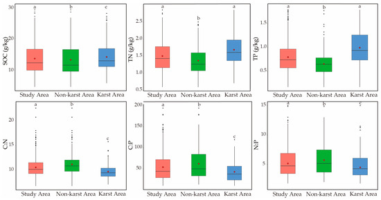 Descriptive statistical analysis was performed on 427 soil samples, and the results are shown in Figure 2. The mean contents of SOC, TN and TP in the soil were 13.69, 1.50 and 0.80 g/kg, respectively, while the mean values of C:N, C:P and N:P were 10.57, 54.16 and 4.96, respectively. The coefficient of variation allows for the comparison of the degree of dispersion of data from different groups, which is important for measuring the degree of disparity in the data and the trend of change. The degree of variability in soil properties, according to the coefficient of variation, is divided into three categories in soil science: 0–15% for weak variability, 16–35% for moderate variability and greater than 36% for strong variability [37]. The variation coefficients for SOC, TN and TP in the study area were 37.09%, 30.17% and 43.17%, respectively. It can be seen that there is a moderate change in TN and a strong change in SOC and TP, with variation coefficients of 18.78%, 60.46% and 50.23% for C:N, C:P and N:P, respectively. Among the six coefficients of variation, it can be seen that C:P had the largest coefficient of variation, whereas C:N had the smallest coefficient of variation, indicating weak variation. From Figure 2 it can be seen that the mean contents of SOC, TN and TP were lower in non-karst areas than that in karst areas, while the mean values of C:N, C:P and N:P were higher than those in karst areas.