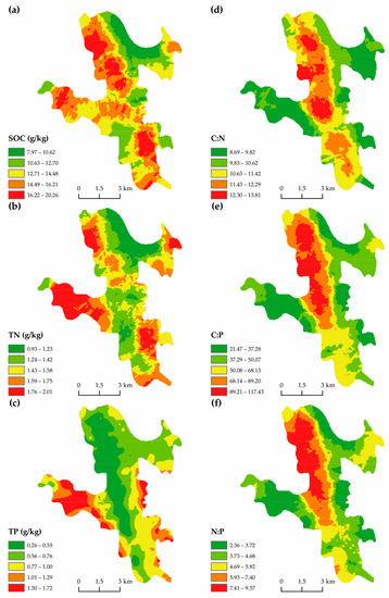 Kriging interpolation results of C, N, P, C:N, C:P and C:P in soils in the study area are shown in Figure 3. Based on the interpolation of soil C, N, P stoichiometric data, it can be seen that the spatial distributions of SOC and TN have approximately the same trend, and the areas with SOC and TN contents greater than 14.49 and 1.59 g/kg, respectively, show strips as well as some blocks along the forests; the main land-use types were forests, paddy field and shrubs areas. TP content greater than 1.01 g/kg was mainly distributed in dry land surrounded by shrubs and paddy field. The spatial distribution trends of C:N, C:P and N:P in soils were consistent, and the land-use types were forests and paddy field.
