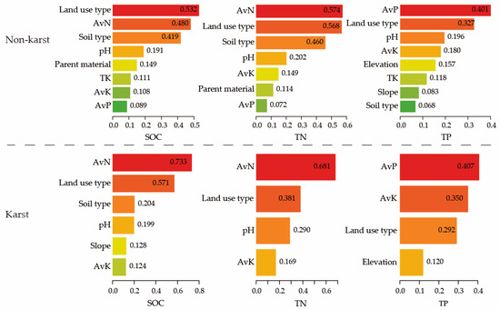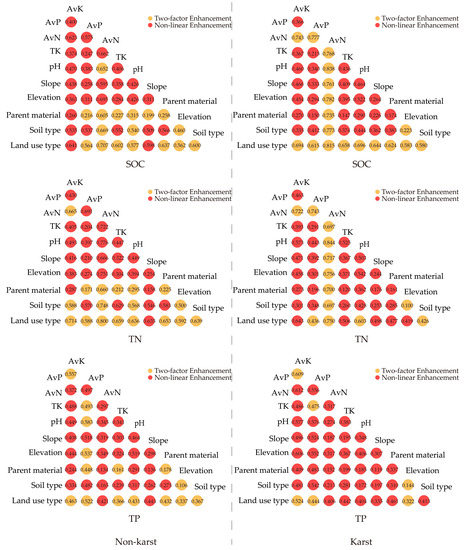 The results of the interaction detection analysis in non-karst and karst areas are shown in Figure 6, which shows that mainly nonlinear enhancement and two-factor enhancement between the influencing factors in the non-karst areas suggest that the qv of factor interactions for SOC, TN and TP is greater than that of single factors. In both non-karst and karst soil SOC, the factor pairs interacting with land-use type and AvN were greater than 0.562, and were mainly bi-factorially enhanced and non-linearly enhanced. In non-karst areas, SOC was influenced by factor pairs of soil types in addition to factor pairs of land-use types and AvN. Additionally, AvN and pH factor pairs in karst areas had the largest qv. Soil TN in non-karst and karst areas was also influenced by land-use type factor pairs and AvN factor pairs, and soil TN in non-karst areas was also influenced by soil type factor pairs. Soil TN in non-karst and karst areas was also influenced by land-use type factor pairs and AvN factor pairs; similarly, soil TN in non-karst areas was also influenced by soil type factor pairs. The qv for pH factor pairs in soil TN in karst areas were higher than in non-karst areas. Soil TP in non-karst and karst areas was influenced by both land-use type factor pairs and AvP factor pairs.