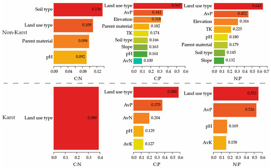 In general, the qv of the factors influencing soil C, N and P and their stoichiometry in the karst and non-karst areas were basically the same throughout the study area, with more explanatory factors in the non-karst areas than in the karst areas. The main influencing factors for karst and non-karst areas were land-use type and AvN and soil type, elevation and pH, respectively, indicating that these five factors were the main factors influencing the spatial heterogeneity of soil C, N and P and their stoichiometry in the study area.