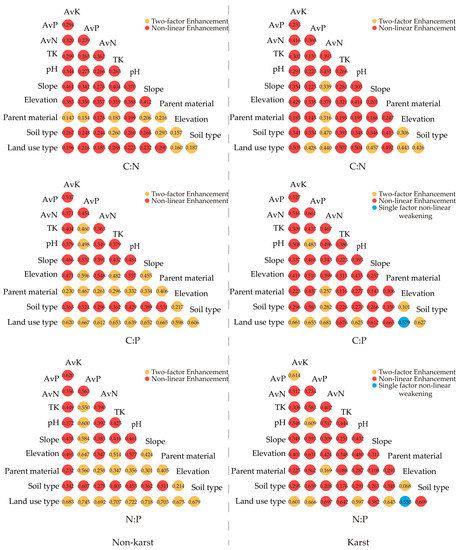 The different influencing factors and interactions among them on the spatial variation of soil C, N and P, and their stoichiometry in the study area were quantitatively analyzed using factor detection. Ten factors, including land-use types, soil type, AvN, AvP, AvK, pH, parent material, elevation, slope and TK, were selected using the geodetector method. The results of the geodetector factor detection of soil C, N and P and their stoichiometry in the non-karst and karst areas are shown in Figure 4, where all listed factors fit the significance test (p < 0.05). The results show that there were eight factors could explain SOC in non-karst areas; the top three main factors are land-use type, AvN, and soil type, indicating that land-use type, AvN and soil type are the main factors affecting SOC in non-karst areas. In the soil TN in non-karst areas, AvN, land-use type and soil type accounted for a relatively large qv. Similarly, there were eight main factors influencing soil TP, with the first three main factors being AvP, land-use type and pH, and soil type having the least qv. In karst areas, soil SOC had six explanatory factors, of which the first three main factors were AvN, land-use type and soil type, and the least explanatory power was that of AvK. In karst soils, both TN and TP had four explanatory factors, of which the main influencing factors in TN were AvN, land-use type and pH, and the main factors in TP were AvP, AvK and land-use type. The results show that influencing factors in non-karst areas were different from those in karst areas, but the main factors affecting the distribution of C, N and P in non-karst and karst soils were basically the same.