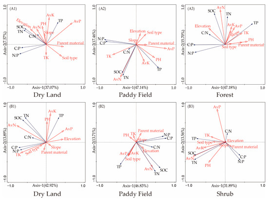Soil C, N and P and their stoichiometric characteristics shown in Figure 8 in the dry land, paddy field and forests land within the non-karst area were explained by 37.07%, 47.14% and 47.18% in the Axis-1, respectively. The qv of the factors in descending order (p < 0.05) is as follows: AvP > elevation > parent material > soil type > AvN > AvK in dry land, AvP > AvN > TK > pH > AvK in paddy field, and pH > AvN > TK > elevation > parent material > AvK> AvP > in forests.