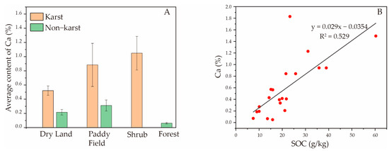 Contents of Ca in different land-use types and the relationship between Ca and SOC. (A) The average content of Ca in karst and non-karst areas under different land-use types, and the error bar represents standard deviation. (B) The linear relationship between Ca and SOC in the study area.