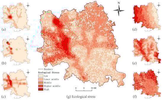 Spatial differentiation of ecological stress and their indicators. (a) Population stress; (b) Industrial stress; (c) Transportation stress; (d) Drought stress; (e) Flash flood stress; (f) Soil erosion stress; (g) Ecological stress.