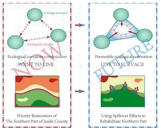 In order to improve the selection of priority restoration areas, a grading system was assigned to ecological corridors. The corridors between primary ecological sources were considered as first-class ecological corridors, while the corridors connecting first-class ecological sources to second-class ecological sources were labeled as second-class ecological corridors. Line density analysis and normalization were performed to identify important areas for the construction of the ecological space network. Subsequently, the negative impact on ecosystem quality was superimposed with corridor density to obtain a map of key restoration areas. This map clearly indicates areas that are crucial to the overall ecosystem, as well as areas with relatively poor ecosystem quality, allowing for a scientific and clear selection of priority areas and their specific boundaries from a holistic perspective of the community of life. Additionally, the ecological restoration of key areas not only incurs relatively lower costs compared with the restoration of entire areas but also yields enormous benefits that can be instrumental in promoting the overall improvement of the ecosystem quality in Suide County.