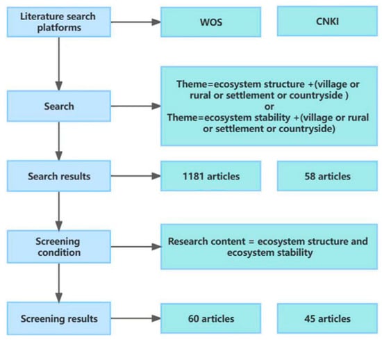 First, a literature search was carried out based on the core databases of China Knowledge Network (CNKI) and Web of Science (WOS). The deadline was 7 July 2022. Using “theme” as the search item in the WOS core database and taking “ecosystem structure” and “ecosystem stability” and ”village” + “rural” + “settlement” + “countryside” as search terms, 1181 pieces of literature were found. In the CNKI, with “theme” as the search term, “ecosystem structure” and “ecosystem stability” and “village” + “settlement” + “village” + “countryside” + “village” as the search terms, a total of 58 pieces of literature were obtained.