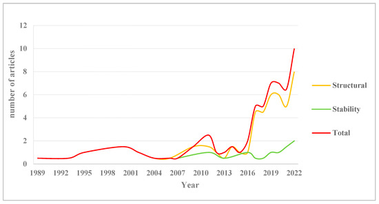 The number of published articles is rising (Figure 2); we summarize the trend in the following phases. From 1989 to 2010, the first stage was the embryonic stage. Literature began to appear one after another, and the annual publication volume of literature was less than 5. In the second stage, the number of articles showed fluctuating growth from 2011 to 2016. The last phase, from 1989 to 2010, showed a steady trend of growth, with an average annual number of 10 or more publications.