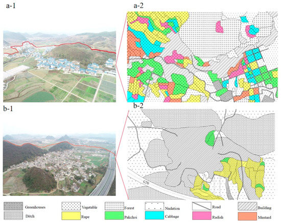 Landscape pattern of village ecosystem. (a-1) Youqi Village—Photo taken by drone. (a-2) Youqi Village—Landscape pattern diagram of village ecosystem. (b-1) Wangjiazhai Village—Photo taken by drone. (a-2) Wangjiazhai Village—Landscape pattern diagram of village ecosystem.