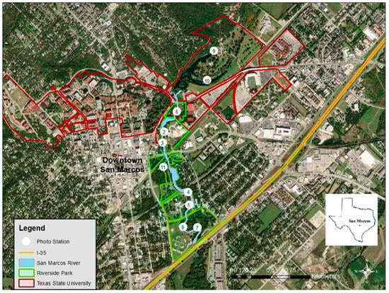 The San Marcos River (SMR) along with its tributaries, wetlands, and lake are centrally located within the city of San Marcos (Figure 1) and represent a social–ecological system (SES). These waterscapes provide a multitude of ecosystem services that benefit the surrounding communities [7,8]. The spring-fed river ecosystem is a habitat for several endangered species and possesses important biodiversity [64,66]. In the coming years, the San Marcos River SES will be challenged by tradeoffs between ecosystem health and development [7]. These future tradeoffs make San Marcos a valuable case study for measuring social demand of urban blue spaces and community preferences for future land and water management. An analysis of community SES values and mental health is necessary to provide reflexive decision making in these tradeoff scenarios. The data collection for this study took place at 10 sites along the San Marcos River, its headwaters and wetlands at Spring Lake, and one of its tributaries. See Appendix A for site descriptions of these 10 waterscapes.