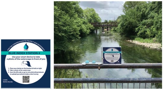 Data were collected over a 10 month period (29 May 2021 to 4 March 2022) using 10 Blue Index photo stations. Each station consisted of an L-shaped frame attached to an existing bridge or post and an acrylic sign (15 cm × 15 cm) with instructions for submitting photos and participating in the assessment. This structure forms a fixed photo station where a participant can place their cell phone and submit a photo of the waterscape they are visiting (Figure 2). Participants accessed the assessment through a quick response (QR) code posted on the acrylic sign. Participants were required to have a cell phone and access to cellular data to use the Internet, as almost all of the study sites were in public parks without free Wi-Fi.
