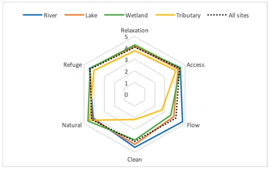 Distribution of mean perceptions of waterscape characteristics across waterscape settings.