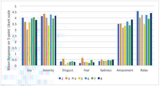 Average intensity of emotional experiences across perennial sites along the San Marcos River. Chart legend: City Park (2), City Park on Bridge (3), Rio Vista Island (4), Rio Vista Park (5), Sewell Park (6), Ramon Lucio Park (7), and Wilderness Park (8).