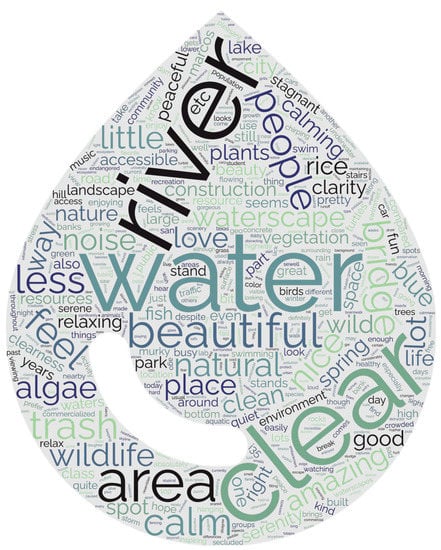 The benefits of blue spaces and waterscapes are particularly needed in cities with heightened stresses from urban heat islands, poor air quality, traffic, noises, and technological worries. Urban waterscapes can also promote community health and ensure equitable access to ecosystem services within a city [5,7,9]. While several studies have documented the mental and physical benefits of waterscapes [6,12], cultural and emotional aspects of human interaction with water are rarely quantified and even less frequently incorporated into meaningful action or policy [13,14,15,16]. These aspects of interaction, however, are meaningful and can guide the sustainable management of urban waterscapes [17].