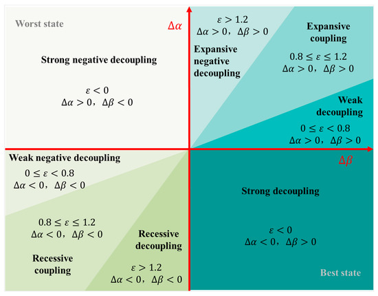 Originating in physics, decoupling theory was pioneered by the Organization for Economic Cooperation and Development (OECD) for use in economics and has now become a well-established quantitative method for analyzing the relationship between economic growth and resource consumption and environmental change. The OECD defines decoupling as the breakdown of the coupling between economic growth and environmental shocks, i.e., the absence of simultaneous changes between the two. The OECD proposes a method for calculating decoupling indicators and further classifies the types of decoupling into absolute, relative and non-decoupling [52]. The decoupling theory proposed by the OECD has obvious shortcomings, specifically, the different choices of the base period cause changes in the decoupling index, which leads to uncertainty in the determination of the decoupling type; moreover, the fewer delineations of the decoupling types lead to rougher conclusions of the study, which is of low guiding significance for practical application [53,54]. The current common decoupling model is the one proposed by Tapio, which is adopted in this paper. The Tapio decoupling model uses the elasticity coefficient method to calculate decoupling indicators, with 0.8 and 1.2 as the thresholds for decoupling indicator classification and classifies decoupling types into 8 categories according to the direction (positive or negative) of economic output and resource consumption growth [55]. The Tapio decoupling model cleverly sidesteps the shortcomings of the OECD model and it has been used as a primary tool to measure the compatibility of urban economic growth with resource consumption and environmental change and the possibility to achieve sustainable development [56,57].
