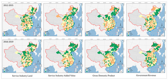 Local autocorrelation analysis using Geoda software can detect the spatial association patterns of local areas in different regions and identify the degree of similarity (positive correlation) or difference (negative correlation) between different cities and their neighboring cities. The spatial association of service industry land in Chinese cities is not significant, but the spatial dependence of service industry added value, gross domestic product and government revenue is significant. The comparison between the periods of 2012–2015 and 2016–2019 shows that the spatial positive correlation covered a gradually expanding geographical area and increasing spatial agglomeration. There were a large number of HH and LL cities, distributed in clusters, while in the same period, there were fewer LH and HL cities, which failed to form spatial clusters and were scattered in the peripheral areas of HH and LL cities.