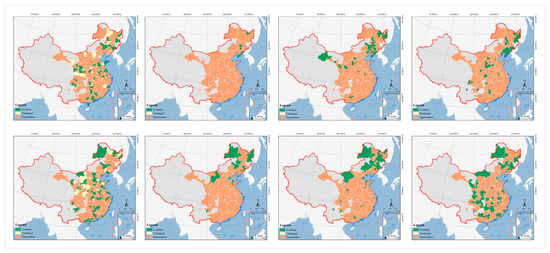 Based on the experience from relevant research [60,61], and the positive and negative results of and , this paper classifies the decoupling into 3 types and 8 sub-types with 0.8 and 1.2 as the classification thresholds for (Figure 3). The first type is decoupling, including three sub-types of strong decoupling, weak decoupling and recessive decoupling. Strong decoupling is the most favorable state, which implies continued growth in economic output while the size of service land continues to shrink, indicating a highly intensive use of service industry land. Weak decoupling ranks second, which shows that the economic output index grows rapidly along with the expansion of service industry land, with the economic growth faster than the land growth, indicating an efficient use of service industry land. Recessive decoupling is unfavorable, which shows that the service industry land use and economic output are shrinking, with land use declining at a faster rate, indicating an intensive land use contraction. The second type is coupling, including two sub-types of expansive coupling and recessive coupling. It reflects the simultaneous rise or fall in service industry land with the change of economic output, standing for an intermediate transitional state between intensive and extensive land use. The third type is negative decoupling, including three sub-types of strong, weak and expansive negative decoupling, and all indicating unhealthy states of extensive land use. Strong negative decoupling is the most unfavorable, showing that the corresponding economic output keeps declining in the face of the growth of service industry land. Weak negative decoupling shows a decrease in both the size of service industry land and economic output, with a faster economic downturn. Expansive negative decoupling shows that both service industry land and economic output are growing, with the land consumption at a higher speed.