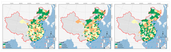From the perspective of changes in decoupling type between 2012–2015 and 2016–2019, 91 cities achieved evolution, accounting for 33.33%, mostly located in central and north China. A total of 96 cities showed degeneration, accounting for 35.16%, and they were concentrated in the northeast region, but very scattered in other regions. There were 86 cities unchanged, accounting for 31.51%, mostly located in the eastern Yangtze River Delta and the west coast of the Strait region (Figure 9 and Table 3).