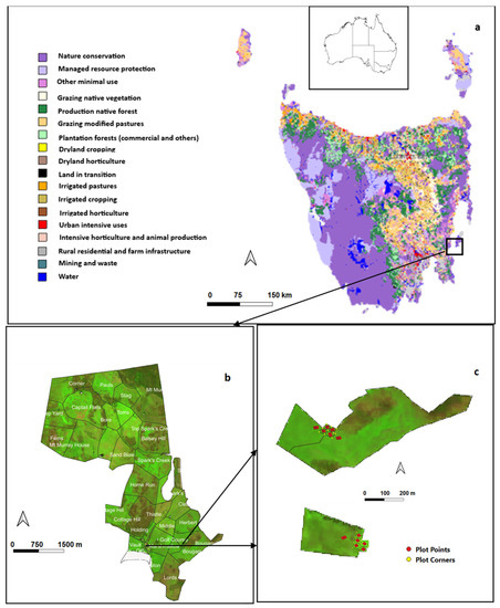 Study site (a) land use for Tasmania, (b) farm property, comprising 52 paddocks, and (c) subplots used for field sampling, [three larger plots (10 ha, 14 ha and 54 ha) were used as controls, while treatment plots had sizes of 0.2–0.4 ha]. The first six plots were located on a paddock called “Bougainville” on a hill. Land use data in (a) was obtained from the Australian Government, Department of Agriculture, Fisheries and Forestry, land use and management (accessed 10 October 2022).