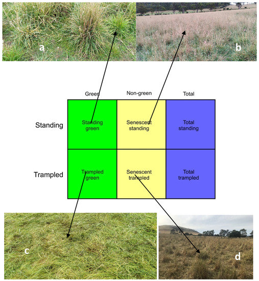 Pasture biomass categories enumerated using destructive harvests at Okehampton, Tasmania, Australia. We measured (a) standing green biomass and (b) standing dry biomass prior to grazing; post-grazing we also measured (c) trampled green biomass and (d) trampled dry biomass. Photographs (a) and (b) were taken in autumn, (c) in winter and (d) in summer. We refer to destructive sampling data herein as ‘measured’ data. Total standing dry matter (TSDM) was computed as the summation of green and dry standing biomass.