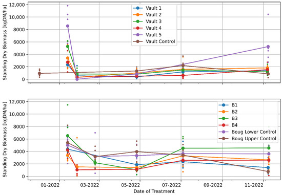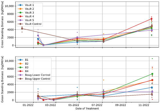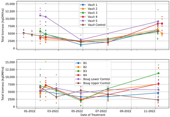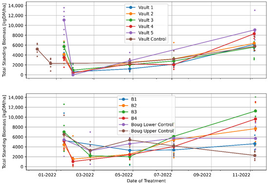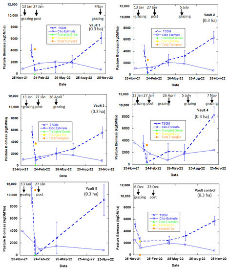 In all treatments and BAU plots, pasture biomass removal through intensive and conventional (control) grazing typically shows biomass loss between pre-grazing (December 2021–January 2022) and post-grazing (January–February) in phase 1 (Figure 3). This is also observed in phase 4, where Vault 2 and Vault 4 plots went through a post-grazing regime (Figure 3). The actual biomass consumed in the one-day grazing for all treatments is shown in Figure 3. As shown in Figure 3, the actual biomass utilised (see Equation (2)) through grazing is low compared to the trampled biomass (see Equation (3)) for all treatment plots (BAU inclusive). Therefore, trampling has a more significant effect on the TSDM than the actual grazing (i.e., consumption).