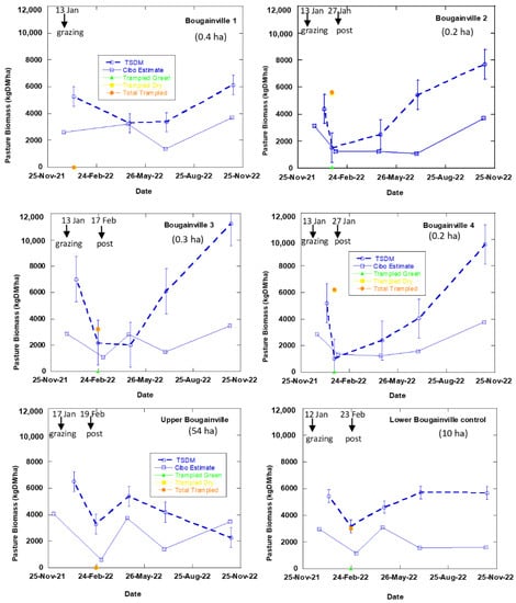 This study examined the effect of regenerative grazing treatments (i.e., short, intense grazing and rest periods) with smaller plots (less than 1 ha) on pasture productivity, consumption, and trampling. In the treatment plots examined, regenerative grazing did not influence pasture biomass productivity in the wet year of 2022. All treatment plots, including the ones used for conventional grazing (control), have similar results (Figure 3, Figure 4, Figure 5 and Figure 6). ANOVA and generalized linear models (GLM) showed no significant association between treatment plots and pasture biomass productivity (TSDM). However, there were significant differences when the date of grazing was used as an effect of treatment (Section 3.1). GLM model shows a strong statistical significance exists only with the treatment plots (i.e., Vault 1, Vault 2, Vault 3, Vault 4, Vault 5, Bougainville 2, and Bougainville 4) associated with the post-grazing event of 27 January 2022 (Section 3.1). Therefore, this study concluded that the variability in the TSDM can only be explained by the treatment plots associated with the post-grazing regime in phase 1 of the experiment. The time series charts in Figure 3, Figure 4, Figure 5 and Figure 6 confirm that although all treatment plots exhibited similar results, Vaults 4 and 5 showed significant variability with pasture biomass productivity. Similarly, the Bougainville 2, 3, and 4 plots benefited from rainfall to produce more biomass in the spring [53].