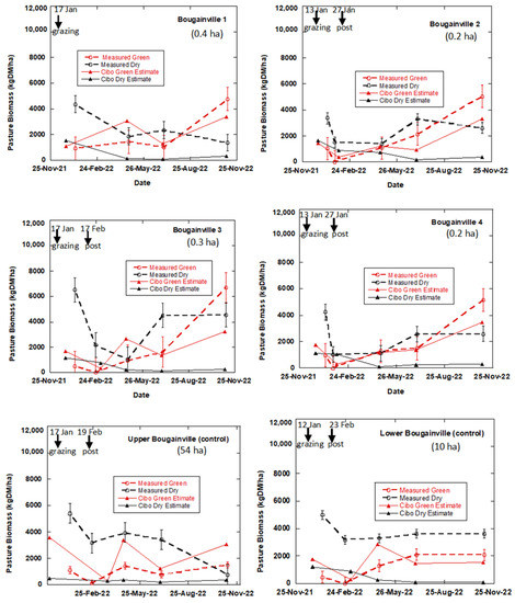 On the account that Sentinel-2 could retrieve total standing green and dry matter from the plot with a size less than 1 ha, pasture estimates from Cibo Labs were evaluated by comparison with corresponding measured values for each time point (in each case using the most proximal Sentinel-2 imagery). Comparisons of measured against estimated data were assessed using, time series trendline and error bar, root mean square error, and R2 following [15,29,52].