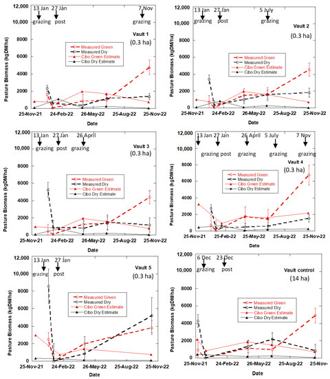 Cibo Labs accounted for the variability in the TSDM in the treatment plots (between and within) but underestimated this value, compared with the measured TSDM (Figure 9). There are instances (phases 1–4) where the satellite estimated TSDM values closely (Bougainville 1, 2, and 4 and Vaults 1, 3, and 4) matched the measured points. For all the treatment plots excluding Upper Bougainville and Lower Bougainville which went through conventional grazing (control), the Cibo Labs passes through one or more error bars, indicating it is within an acceptable variability of the measured biomass. The plot (Vault 4) which went through repeated grazing treatment every three months is more closely associated with the measured variability than Vault 1 which was grazed only once, or Vault 5 with 15 months of rest (Figure 7). The Vault 5 treatment plot has the highest variance.