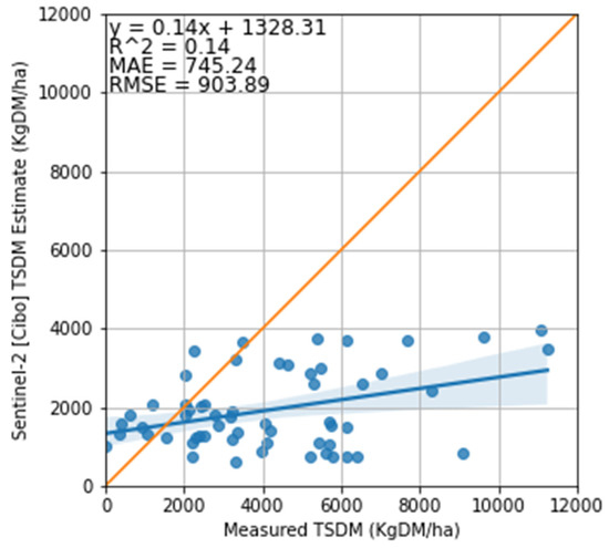 Although the model could retrieve TSDM through inherent Sentinel-2 SWIR band inclusion [19], the association between Cibo Labs TSDM and standing dry DM shows a weak relationship (Figure 11 and Figure 12). Summer is characterised by a high concentration of senescence (Figure 7, Figure 8 and Figure 12) intermixed with green vegetation. Hence, it is challenging to distinguish senesced from healthy vegetation despite the high spatial resolution of Sentinel-2 satellite [64].