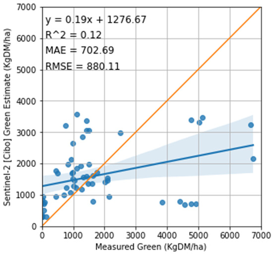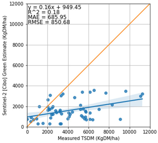 The correlation between the measured standing biomass and Cibo Labs estimates and their respective linear regression plots with R2, mean absolute error (MAE) and root mean squared error (RMSE) are shown in Figure 9, Figure 10, Figure 11 and Figure 12.