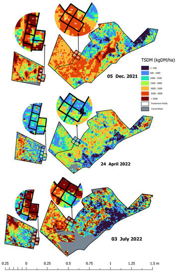 Cibo Labs derived Sentinel-2 maps for the treatment plots at Okehampton, Triabunna, Tasmania show spatiotemporal changes and the variability (within and across) in pasture biomass levels in all the treatment plots including control for pre-grazing and post-grazing activities such as the time series plot discussed in Figure 7. Cloud-free Sentinel-2 imagery to quantify the available pasture biomass against the ground measurement collected on 13 January 2022 before grazing the fields (paddocks) was on 5 December 2021. This makes a lag of 40 days between the available cloud-free satellite imagery and the ground measurement. All treatment plots started with more pasture biomass before grazing. All fields were grazed in phase 1 and left to rest for three months. All fields were grazed in phase 1 and left to rest for three months. After rest, the ground measurement collected on 26 April indicates the treatment plots have not recovered in autumn (proximal Sentinel-2 imagery available on 24 July). However, satellite imagery available on 3rd July against the measured pasture biomass collected on 5th July shows the plots (Vault and Bougainville) show increasing TSDM during winter. The map indicates Bougainville 1 (bottom) is the least-performing treatment plot with reference to phase 3 of the experiment. The maps correspond to Figure 3 and Figure 4 and the modelling time series in Figure 7. As shown earlier (Figure 3 and Figure 4), the map confirmed that Bougainville 1 is the least-performing plot.