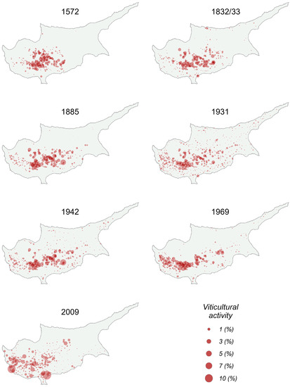 The Statistical Service of Cyprus published in 2011 the results of the “Census of Vines 2009” [47]. The survey records the area under vines for each municipality for the Government controlled area excluding the northern part of the island occupied by Turkish military forces since 1974. The total area of holdings with grape plantations in 2009 amounted to 88.920 decares, which translates to 88.29 km2. Considering that more than 90% of the viticultural activity between 1572 and 1969 took place in the southern part of the island, the report of 2009 can be considered to reflect the modern era transformation of past viticulture. The attributes of each municipality were assigned to the main settlement of each administrative area. However, data from this report are organized by the property holder’s place of residence—not the actual site of the property holding.