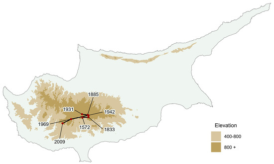 Cyprus passed under Ottoman control in 1571 and remained under that status until 1878, with the inauguration of British rule. The British era lasted until the Declaration of Independence of the Republic of Cyprus in 1960. The present-day de facto partition was the result of political and military actions in 1974. Archaeological evidence suggests that wine production has been practiced in Cyprus for 4 millennia. Written sources point to external trade of Cypriot wine since, at least, the Roman times. It is well-documented as an important trade commodity at least since the Second Crusade in the mid-12th century and it has retained its importance ever after under widely different regimes [8,9,10]. The importance of wine as an external trade commodity led to the availability of a larger amount of information about viticulture in historical times compared to other land uses, spanning a period of about 440 years. Therefore, Cypriot viticulture provides the opportunity to trace the century-scale evolution of the associated land system.