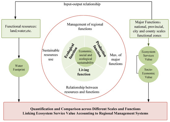 The current insufficient quantification and evaluation of major functions fundamentally affected regional sustainable management and policy implementation. This study focused on the problem that no effective quantitative accounting relationship has been established between development activities and resource utilization. In order to establish the relationship between major function accounting and natural resource accounting, we analyzed the relevant studies on the evaluation of major functions, natural resource accounting, environmental accounting, ecosystem services, and assets accounting. The efficiency comparison of different functions was completed using the equivalent factor method for ecosystem service value measurement and the input–output method for water footprint measurement. We found that the accounting of major functions and resources can guide regional sustainable management by using function positioning and resource comparative advantages. In addition, administrative units were linked to functional units, providing the possibility of cross-regional comparison of total functional resources, efficiency, and structure of major functions.