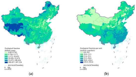 Ecological function distribution in 2019. (a) The distribution of total ecological functions; (b) distribution of ecological function per unit.