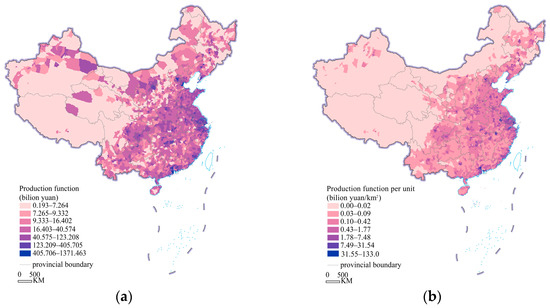 Production function distribution in 2019. (a) The distribution of total production functions; (b) distribution of production function per unit.