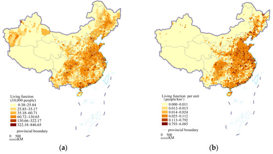 Living function distribution in 2019. (a) The distribution of total living functions; (b) distribution of living function per unit.