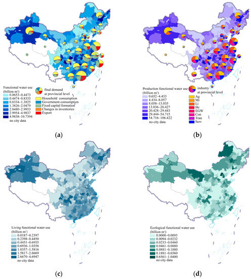 Accounting results of water use for production–living–ecological functions at city level. (a) Functional water use and final demands; (b) production functional water use and industrial water use; (c) living functional water use; (d) ecological functional water use.