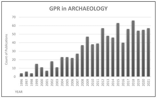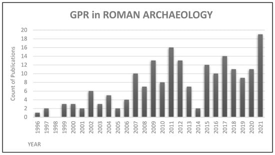 Formal remote sensing approaches have been applied in archaeological research since the late 1960s but have only recently become widespread []. This trend is illustrated in Figure 1, which shows the number of research publications per year (only data from 1996 to 2021 have been selected for the use of GPR in archaeology to match the comparative application in Roman archaeology—Figure 2). The early application of GPR in archaeology was primarily dedicated to methodological articles and reviews focusing on using the techniques in archaeology. In these early publications, the methods, the anomalies recorded by the radargram, and the visualisation tools were suggested as potentially helpful methods for reviewing and analysing archaeological data [,,]. Perhaps the first examples of the application of GPR to address archaeological questions in a relevant way, without focusing on methodological issues, appear reliably from the beginning of the 21st century, with examples of case studies such as Neubauer W. et al. (2002); Piro S. et al. (2003); or Campana, S. et al. (2009) [,,].