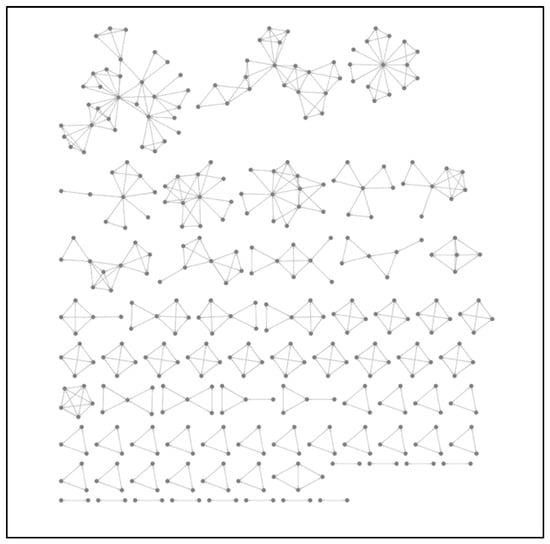 The use of Louvain’s clustering method (Figure 5) [] on the network analysis presented allows us to identify groups of authors who have more or less co-authorship between them. The two largest groups are those dominated by A. Novo and A. Casas, with several co-authors and papers in which one of these authors is a co-author. The relevance of these authors acting as a “bridge” to other co-authors is identified by the centrality measure [] between them (represented as node size in Figure 5 and Figure 6). The two authors mentioned above are co-authors with members of different groups, which gives them a high degree-of-connectedness score with other authors. We can see how A. Novo is in a central position between two groups although sharing relevance with other authors, while A. Casas is not only positioned centrally in a group but also shows the highest ranking in the connectivity function within the collaboration. Therefore, we can interpret that the groups of authors identified with a higher connection function pursue a methodological interest in investigating the use of GPR in archaeological applications (together with their research), which leads them to be co-authors with some authors who share their methodological interests.