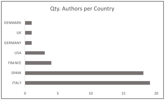 Using as a sample the two main clusters detected through the correlation of publications by authors, we can glimpse relevant data. In this line, the majority presence of the male gender compared to the female gender in publications related to GPR applied in archaeology is evident (Figure 7). Despite focusing on a small sample, the proportions shown are still significant, with 18% for female authors, while male authors account for 82%. Similarly, based on the interdisciplinary presence at the beginning of the application of GPR, as mentioned above, we have drawn attention to the professional profile of the researchers who make up the research groups applying GPR (Figure 8). Visualising the data obtained in the main co-authorship clusters gives us a characteristic image that seems to mark a continuity of the interdisciplinary profile detected at the beginning of applying GPR in archaeological studies. That is to say, a predominance of professionals from outside humanistic disciplines who technically support the development of specific studies. In this way, we can observe how the presence of professionals from the field of geophysics is overwhelming compared to other fields of expertise. Likewise, the specific field of ancient history is practically absent when compared with the works that use an archaeological approach to study the realities of the past, leaving a gap in the analyses that use a perspective from ancient history itself. Finally, it is worth noting that when we analyse which countries contribute to developing studies involving GPR in the knowledge of the past (Figure 9), the main clusters of co-authorship show a significant difference, with Spain and Italy at the forefront of this type of practice.