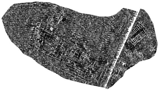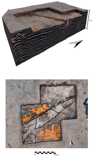 On the other hand, in terms of stratigraphic analysis, the possibilities of the GPR data offered visually interpolated in plan and individualised in longitudinal and transversal profiles or exported three-dimensionally as point clouds seem to us to be very relevant. We are in a position to characterise the archaeological anomalies detected in all their dimensions stratigraphically, establishing their structural relationships, both in plan and in elevation, making it possible to conclude the urban configuration of the settlement studied and often determining different occupational phases that may concur in the diachrony of a settlement []. It is possible to establish preliminary archaeological readings of the main stratigraphic features detected by the GPR, at least in the first few metres of the explored subsoil (Figure 12).